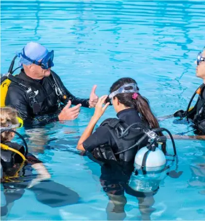 Diver with less dives are diving in a small group – with experienced divers or the dive guide.